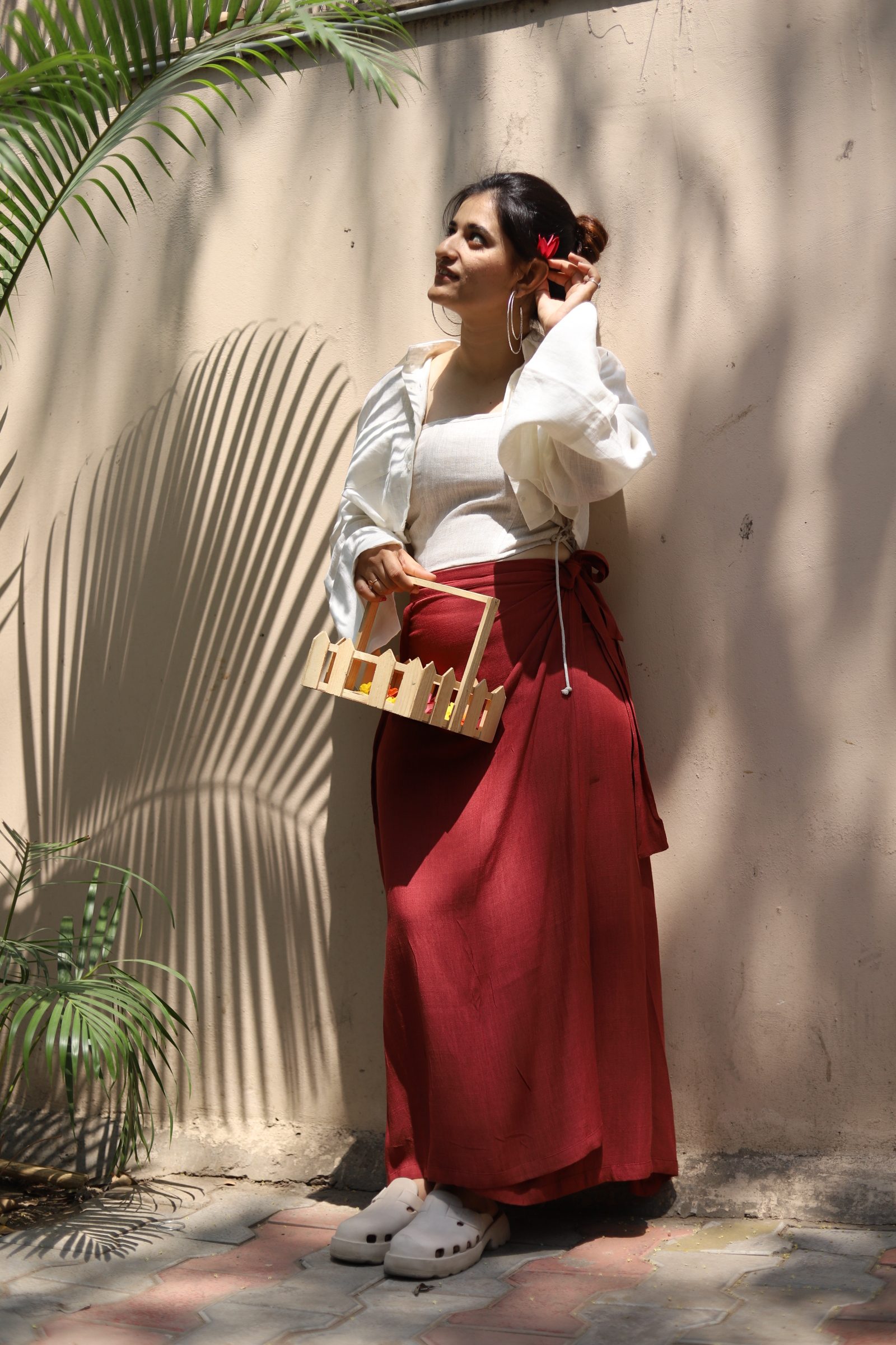 This elegant ensemble features a crisp white linen jacket paired with a flowing red full-length linen skirt. The jacket showcases a tailored fit with a classic collar and long sleeves, exuding sophistication and style. The vibrant red skirt offers a graceful and comfortable fit, making it perfect for formal occasions or cultural events.